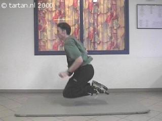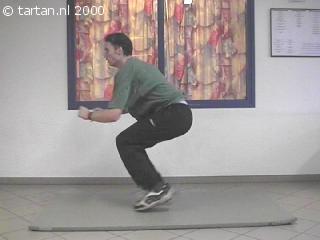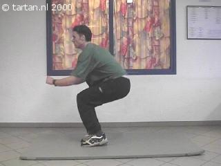 Vanuit knielzit opspringen naar hurk zit. Let op de gestrekte voeten in knielzit! Het terug springen lijkt vrij barbaars voor je knieen maar dat valt uit eindelijk wel mee.