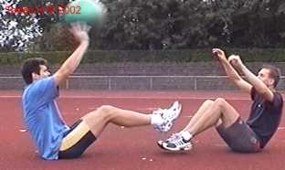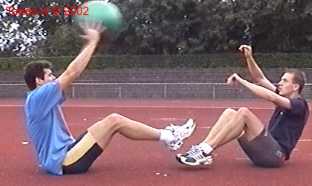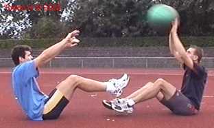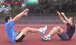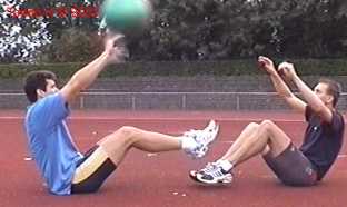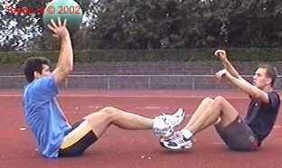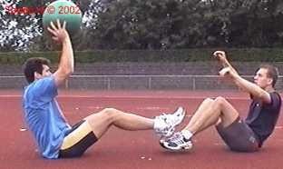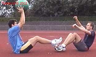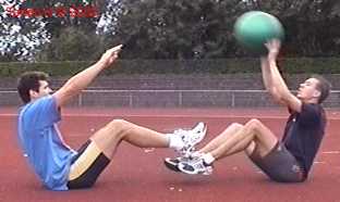 Atleet zit op zijn achterste met de voeten net van de vloer. Alle hoeken zijn zoveel mogelijk 90gr. De bal wordt net boven hoofd hoogte aangegooid en zoveel mogelijk terug gekaats (als met volleybal).
