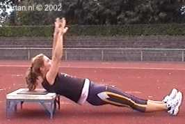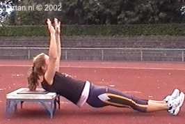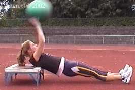 Oefening voor de buik-rug coordinatie. Zowel met vangen als gooien moet de spanning snel van rug naar buik en weer terug. Door een been op te trekken wordt de hamstring meer in de oefening betrokken.