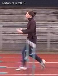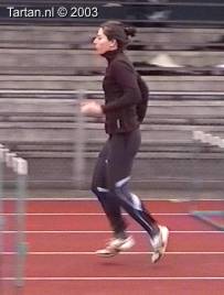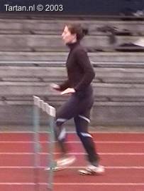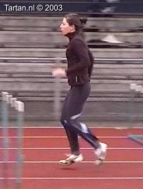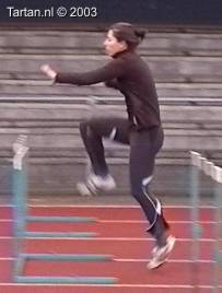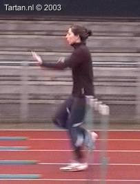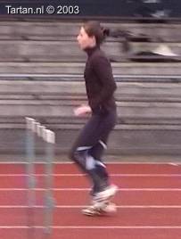 Vlak voor de afzet komt het LZP even achter de voet te liggen, dit gebeurt duidelijk bewust omdat de laatste pas duidelijk groter is als de voorlaatste. Ook de strekking in de afzet (let op de rug) is niet optimaal. Dit is niet wenselijk de twee laatste contacten voor de horde moeten als het waren een stuwende afzet vormen, waarbij de laatste pas kleiner is als de voorlaatste. De strekking van de heup (niet het been) moet volledig zijn.