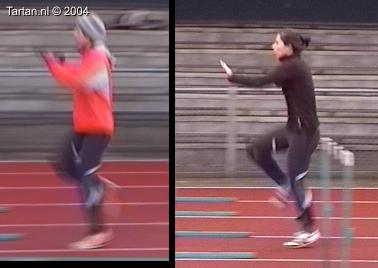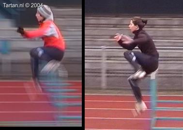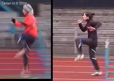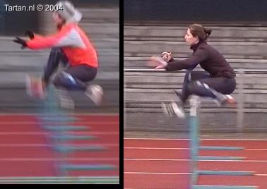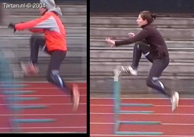 The leadleg tilts the pelvis backwards just after take-off where it should go forward. The backward tilted pelvis prevents the trailleg being pulled through right. After that the athlete fails to reposition the pelvis before landing, leading to a high impact, breaking and poor take-off after the hurdle.