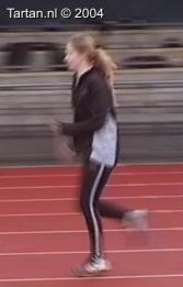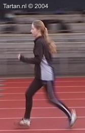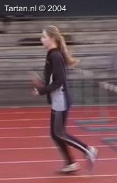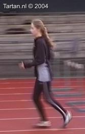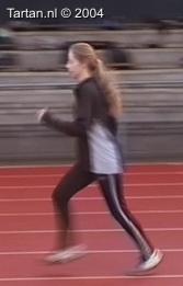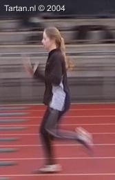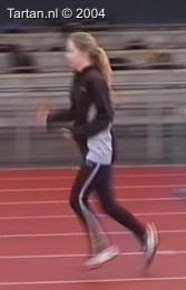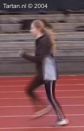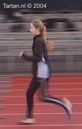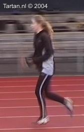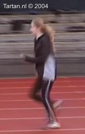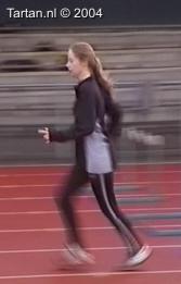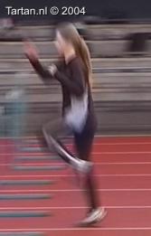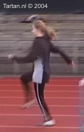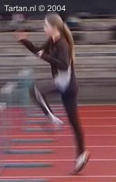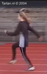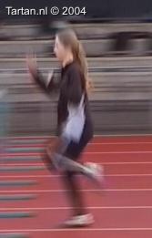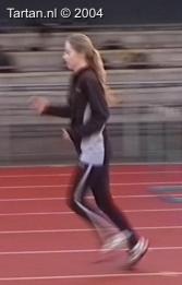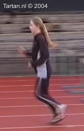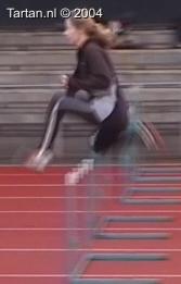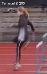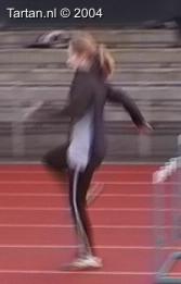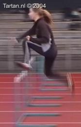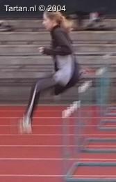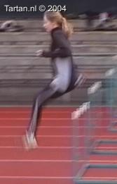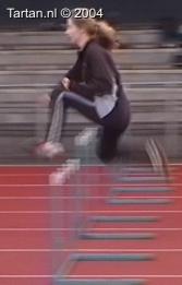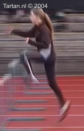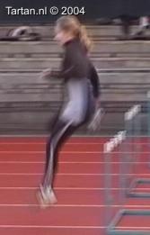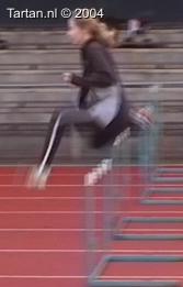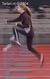 A classic case of juvenal 'hurdle jumping'. The athlete is to close to the hurdle, the leadleg can be extended like it should. The lead leg is rotated outward with the foot behind the knee. Being so high above the hurdle, there is lots of room for the trail leg, no need to pull up that knee. However the trail foot has to be lifted high, preventing it from touching the hurdle on its way down. With the knee pointing downward and the foot so high it is fairly impossible to resume running.